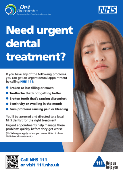 We have secured additional appointments for people across Gloucestershire who need urgent dental care, and we would appreciate your support in raising awareness to make sure people are able to benefit from these appointments. Patients can access these urgent appointments by visiting NHS111 or phoning 111.