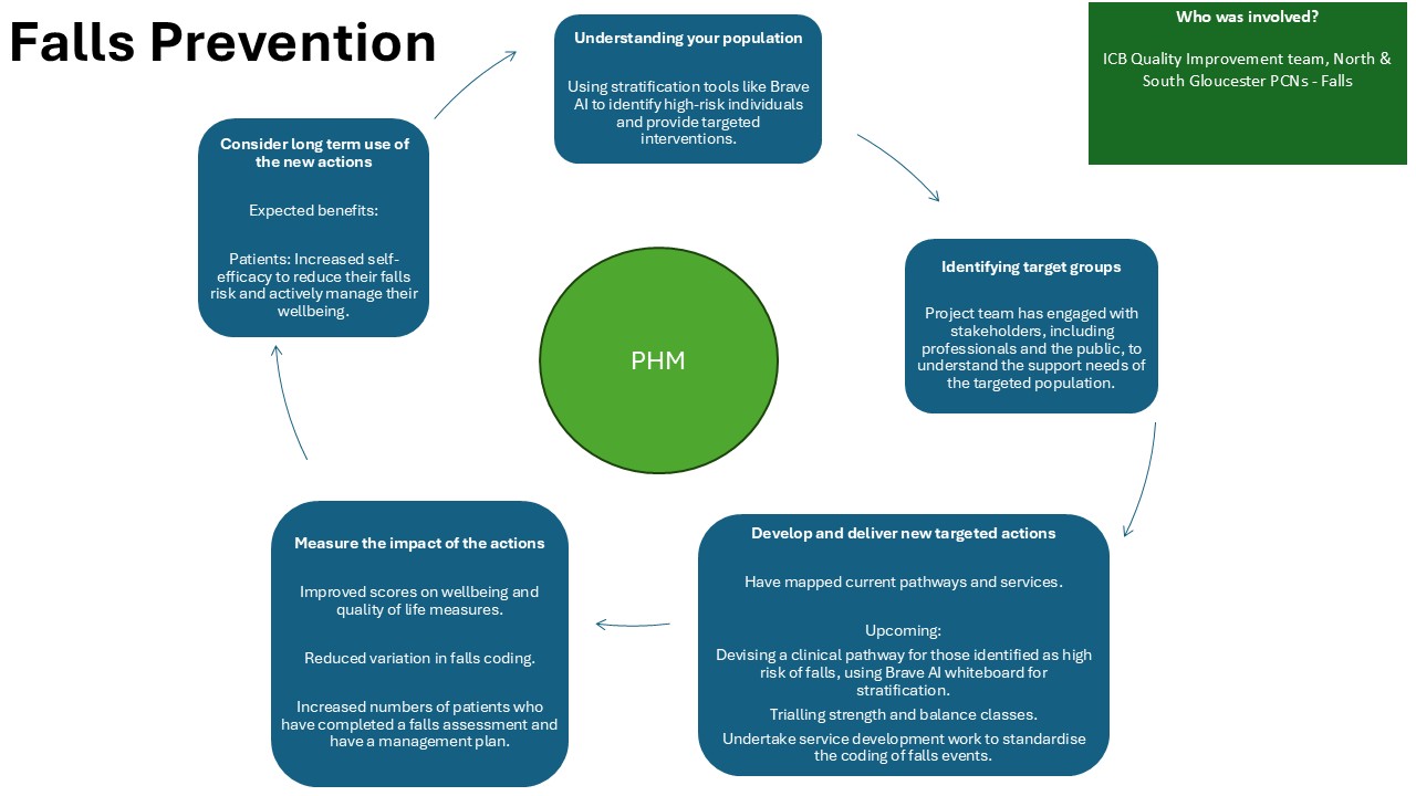 - For Primary Care: Identifying people at risk of falls and providing proactive support will become business as usual, using a PHM approach and the virtual whiteboard tool. A clear pathway will be established to support people identified at high risk of falls.